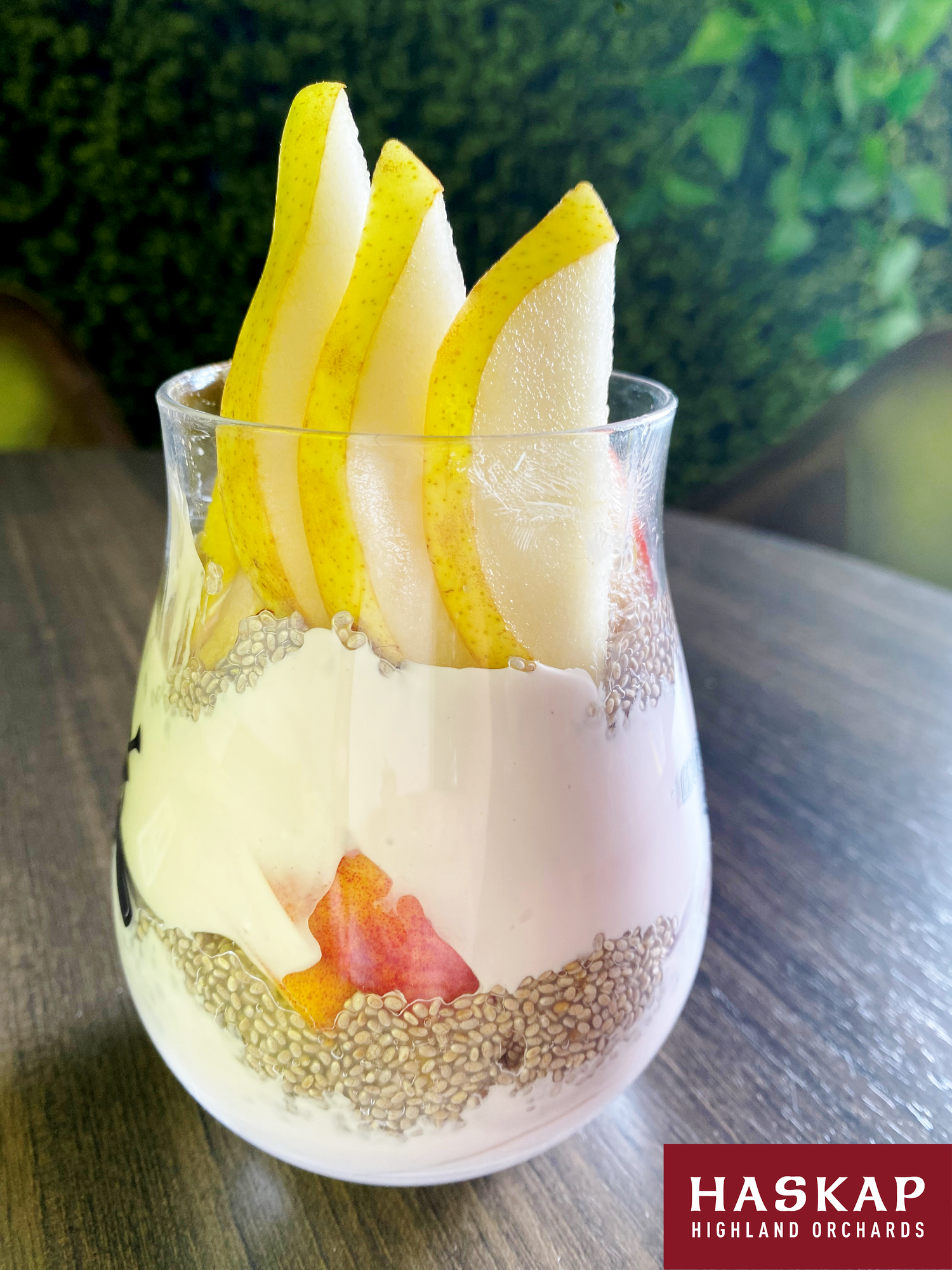 Fresh fruit. (In this recipe, I used pears and peaches to stand out against the purple colour of Haskap mixed yogurt)
